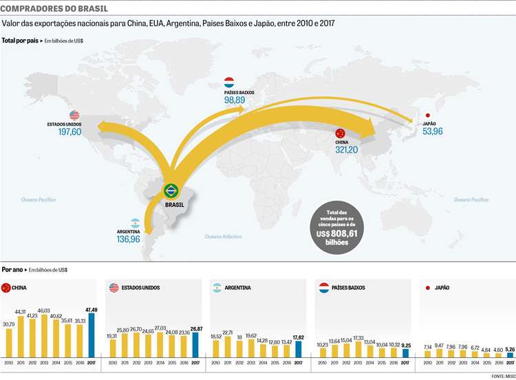 No entanto, somando o valor exportado para a China, Estados Unidos, Argentina, Holanda e Japão, observa-se uma expansão de 23,2% nos embarques durante o ano passado, em relação a 2016, para US$ 106,5 bilhões, mostram dados do Ministério da Indústria, Comércio Exterior e Serviços (Mdic).