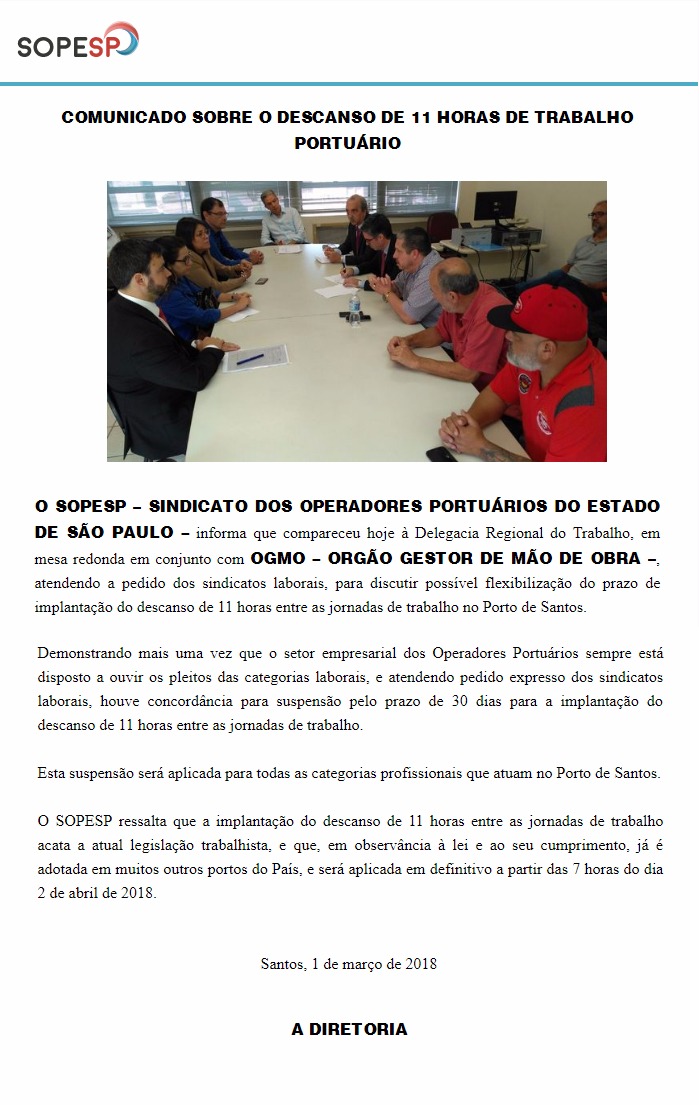 Comunicado SOPESP: descanso de 11 horas de trabalho portuário