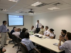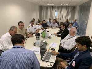 Sobre o andamento do projeto de VTMIS (Sistema de Gerenciamento e Informação do Tráfego de Embarcações), o Gestor de VTMIS do Porto do Rio de Janeiro, Marcelo Santiago Villas-Bôas, que conduz os trabalhos do GT, contou aos presentes sobre a produtiva visita técnica realizada recentemente ao Centro de Controle de VTS do Porto do Açu.