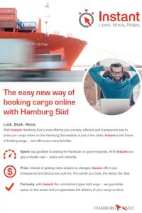 Em apenas alguns segundos, os usuários INSTANTÂNEOS poderão visualizar preços fixos e reservar sua carga diretamente – tudo on-line. As reservas podem ser feitas até quatro semanas antes da remessa planejada. Quanto mais cedo a reserva for feita, menor será o preço total para o cliente – e as alterações subsequentes de preços ou taxas adicionais não serão mais aplicadas. Ao mesmo tempo, a Hamburg Süd garantirá aos clientes que reservam carga via INSTANT que haverá espaço suficiente na conexão selecionada, aumentando assim a previsibilidade de sua cadeia de transporte.