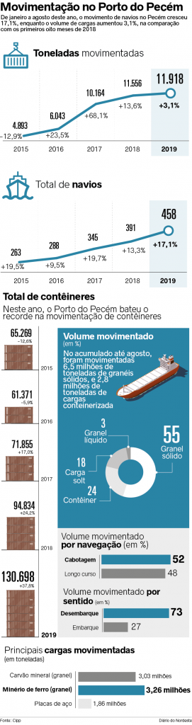 De janeiro a agosto deste ano, a movimentação do Porto do Pecém cresceu significativamente ante igual período do ano passado. O número de contêineres movimentados (130.698) cresceu 37,8%, o total de navios (458) aumentou 17,1%, e o volume movimentado (11.918 mil toneladas) avançou 3,1%. Do total, 52% foi de navegação por cabotagem e 48% de longo curso.