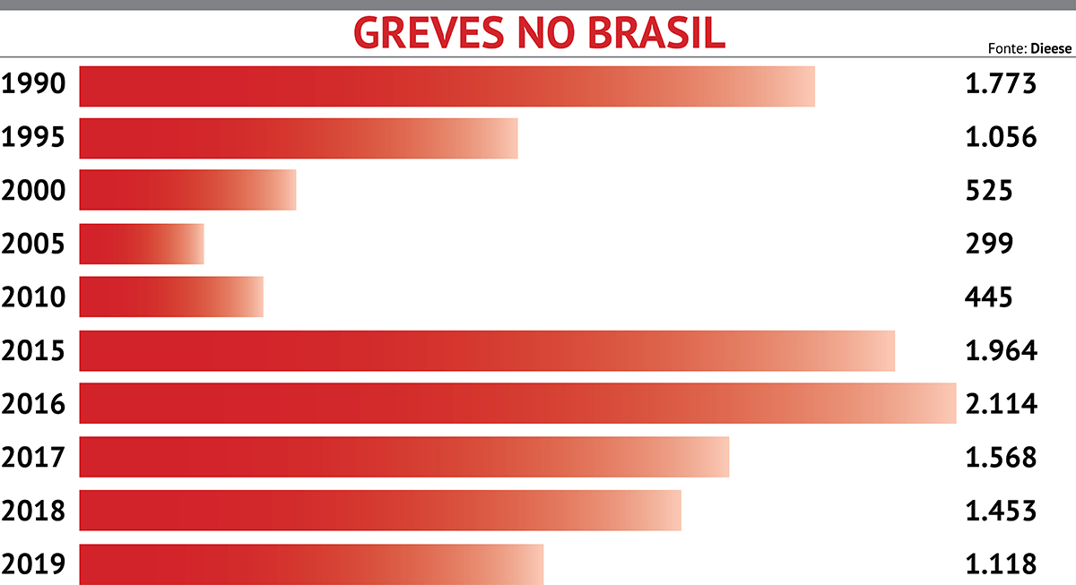 No período mais recente, em 2010, por exemplo, um dos melhores anos da economia brasileira, o número de paralisações foi baixo (445), passando a crescer na medida em que as condições pioraram. Mas o desemprego, que cresceu, também é um fator que normalmente causa redução de movimentos, o que em parte pode explicar o menor número em 2019.