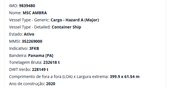 Pertencente à nova geração de navios porta-contentores, o MSC AMBRA tem uma capacidade de 23.756 TEU (twenty-foot Equivalent Unit, medida-padrão utilizada para calcular o volume de um contentor, unidade equivalente a 20 Pés), 400m de comprimento fora-a-fora, 61,5m de boca e um calado de 16,5m. Para além de uma maior capacidade, esta nova classe de navios destaca-se por ser mais eficiente e sustentável em termos ambientais, oferecendo uma maior estabilidade e segurança na navegação.