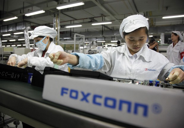 Funcionários trabalham na linha de montagem da fábrica Foxconn na cidade de Shenzhen, na China (Foto: Getty Images)