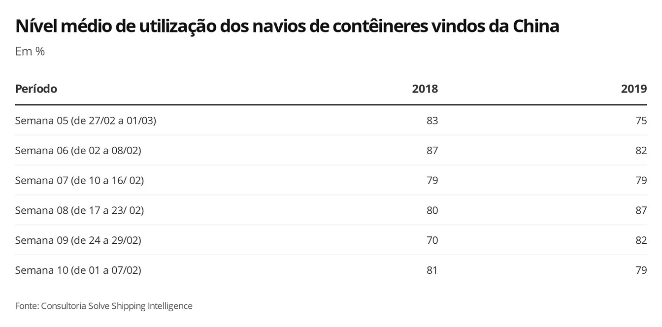 De acordo com o levantamento da consultoria Solve Shipping realizado para a Globonews, na semana entre os dias 24 e 29 de fevereiro, em duas das quatro viagens programadas, os navios deixaram a China carregando 66% e 65% da sua capacidade. Uma terceira viagem foi cancelada e a última saiu com 79%. Apesar do cenário de redução, na semana seguinte o volume médio de carregamento dos navios voltou a subir. Passou de 70% para 81%.