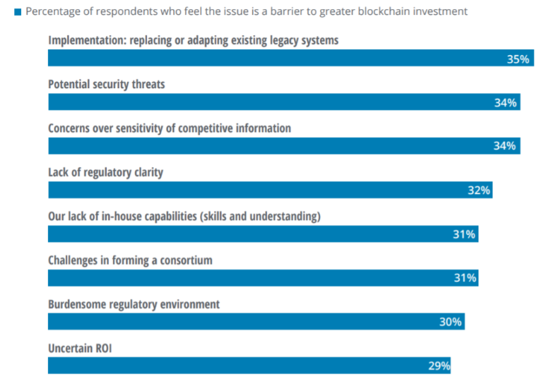 Porcentagem de respondentes que acham que a questão é uma barreira para um maior investimento em blockchain (Imagem: Pesquisa Global sobre Blockchain de 2020 da Deloitte)