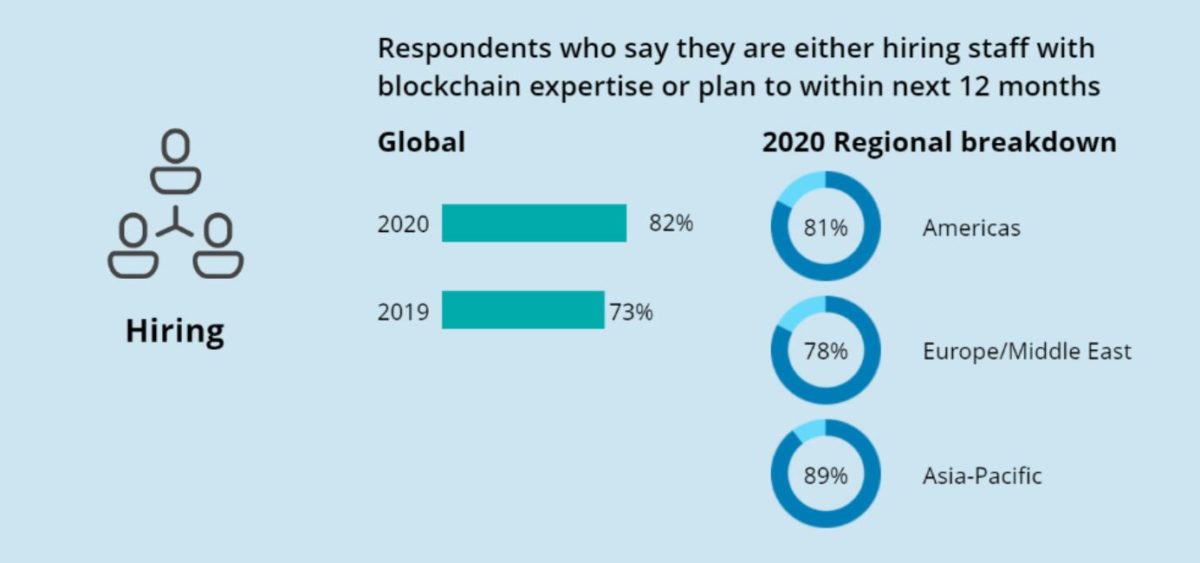 Conforme mais respondentes buscam explorar aplicações de blockchain, 82% estão contratando funcionários especializados em blockchain ou planejam fazê-lo nos próximos 12 meses (no ano passado, esse número era 73%).