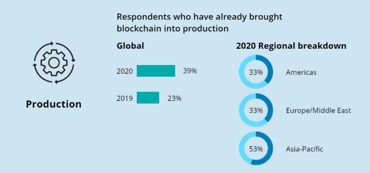 Em 2019, 23% dos respondentes afirmaram terem incorporado blockchain. O número deste ano (39%) é um “salto significativo”, segundo a gigante empresa de consultoria.