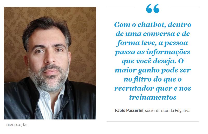 Outra forma de inovação que ganhou força com a pandemia foram os chatbots, que podem ser usados durante todo o processo de contratação. Para Fábio Passerini, fundador e sócio-diretor da Fugativa, empresa de escape games, existem dois pontos de uso que podem se destacar.
