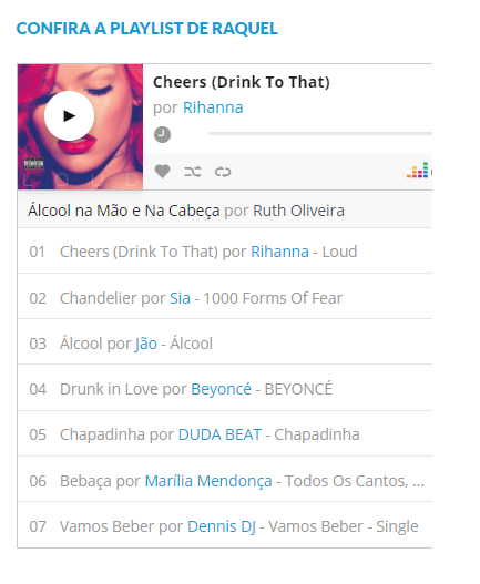 Ela diz que pensou em uma playlist que dialogasse com a pandemia, mas que tivesse diversidade e contasse uma história. “Minha playlist era álcool na mão e na cabeça, pensando na pandemia, mas também em beber e se divertir. Fiz uma brincadeira em que a pessoa bebeu, começou a ficar mal e terminou na reabilitação (com a música Rehab, de Amy Winehouse).”