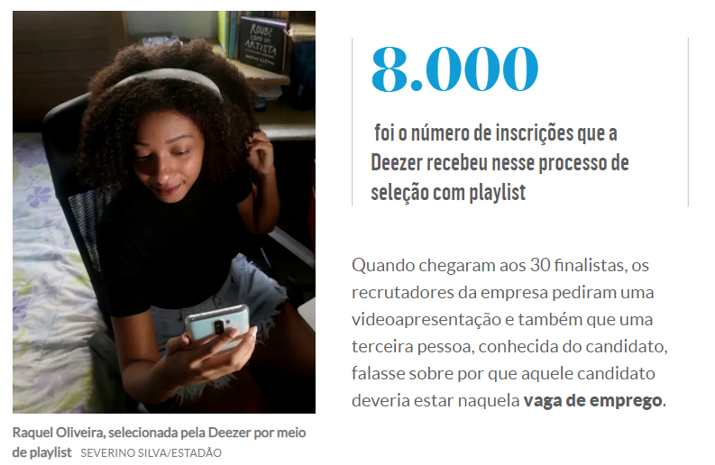 Outra empresa que realizou um processo inovador durante a pandemia foi a Deezer. Sem mais restrições além de serem estudantes com pelo menos mais um ano de graduação, os candidatos interessados precisavam criar e engajar uma playlist com pelo menos 30 faixas.