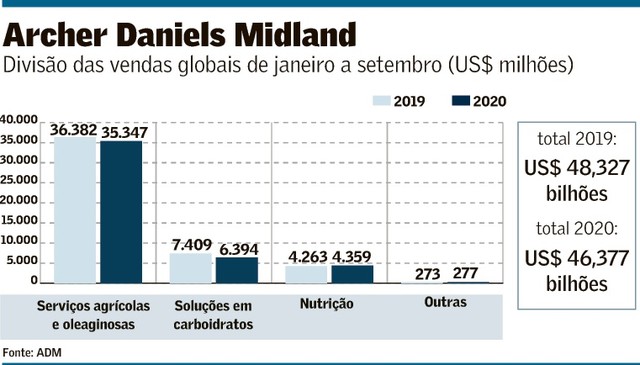 No terceiro trimestre de 2020, as vendas globais da ADM somaram US$ 15,1 bilhões, quase 10% menos que em igual intervalo do ano passado, e o lucro líquido caiu 45%, para US$ 225 milhões, em larga medida por causa da antecipação do pagamento de dívidas. Com a forte alta das cotações dos grãos advinda sobretudo da forte demanda da China, os desafios se multiplicaram na divisão de serviços agrícolas e oleaginosas e as margens no processamento recuaram, mas por trás dos grandes números a performance do segmento de nutrição continuou a chamar a atenção.