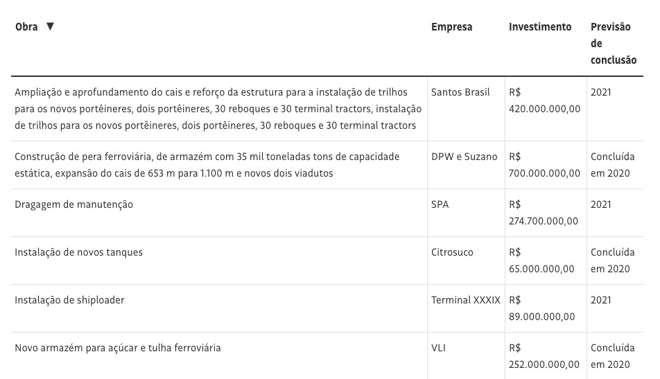 O porto já teve a conclusão de outras quatro obras em 2020, todas recém-inauguradas. Entre elas, a construção de uma pera ferroviária (desvio usado para mudar a direção de uma composição), que aumentou o transporte de celulose por meio de trens. Os investimentos somaram R$ 1,057 bilhão.