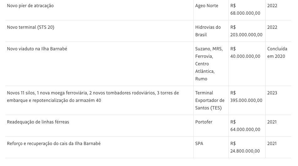 Um dos principais é da Hidrovias do Brasil, que venceu leilão de agosto de 2019 e está investindo R$ 332,5 milhões no novo terminal STS 20, sendo R$ 112,5 milhões referente à outorga, mais os R$ 220 milhões previstos no edital para melhoria da estrutura, como a construção e reforma dos armazéns e berço dos navios.