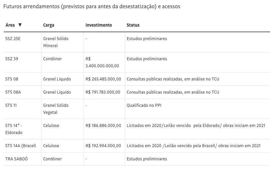 Já entre os futuros arrendamentos previstos para antes da desestatização do porto, estão dois licitados em 2020 e arrematados pela Eldorado e pela Bracell, com previsão de obras em 2021, em investimentos de R$ 380 milhões.