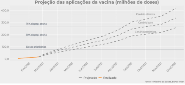 Em seu acompanhamento mensal, Rafaela Vitoria e Daniel Arruda avaliam que os grupos prioritários devem terminar de receber as duas doses entre o final de abril e de maio, a depender da velocidade de aplicação das vacinas adquiridas.