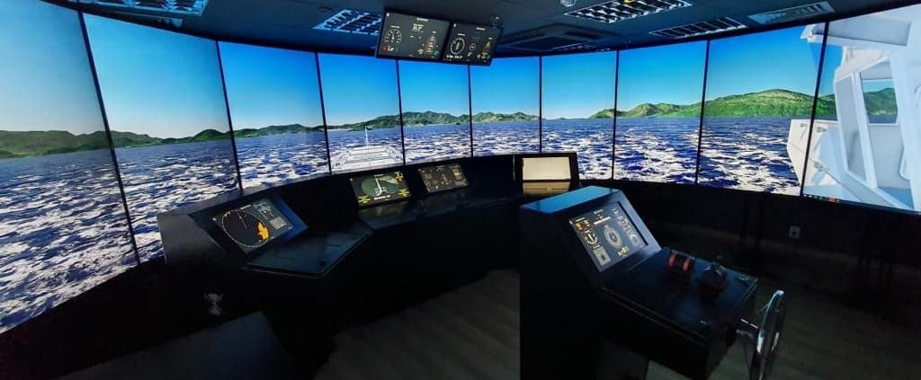 Um simulador é do tipo Full Mission. Com visualização do ambiente externo em 240 graus, ele alterna modelos de diversos tipos de navios, com controles para diferentes tipos de propulsão, inclusive azimutal.