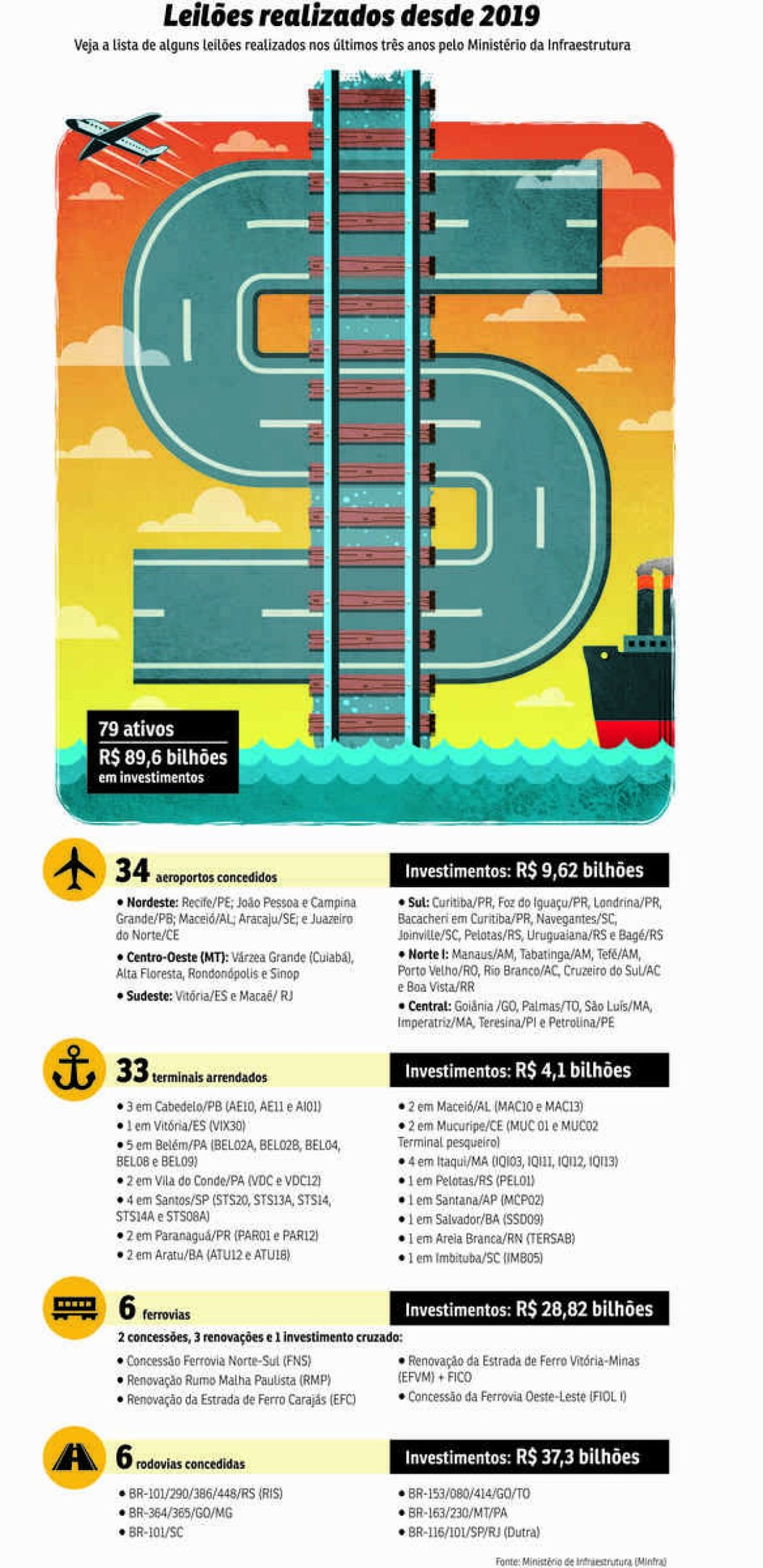 Em evento do setor realizado há três semanas, Freitas informou que foram realizados, desde o início do governo Jair Bolsonaro (PL), 79 leilões no setor de transportes, envolvendo portos, aeroportos, rodovias e ferrovias. Ao todo, esses projetos somam pouco mais de R$ 90 bilhões em investimentos contratados e são capazes de gerar 1,2 milhão de novos postos de trabalho nos próximos anos, de acordo com o ministro.