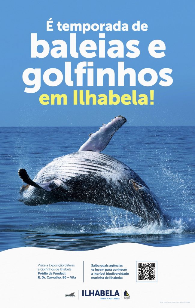Painel do município de Ilhabela, destacando as baleias como um novo atrativo turístico da região – Imagem: Reprodução