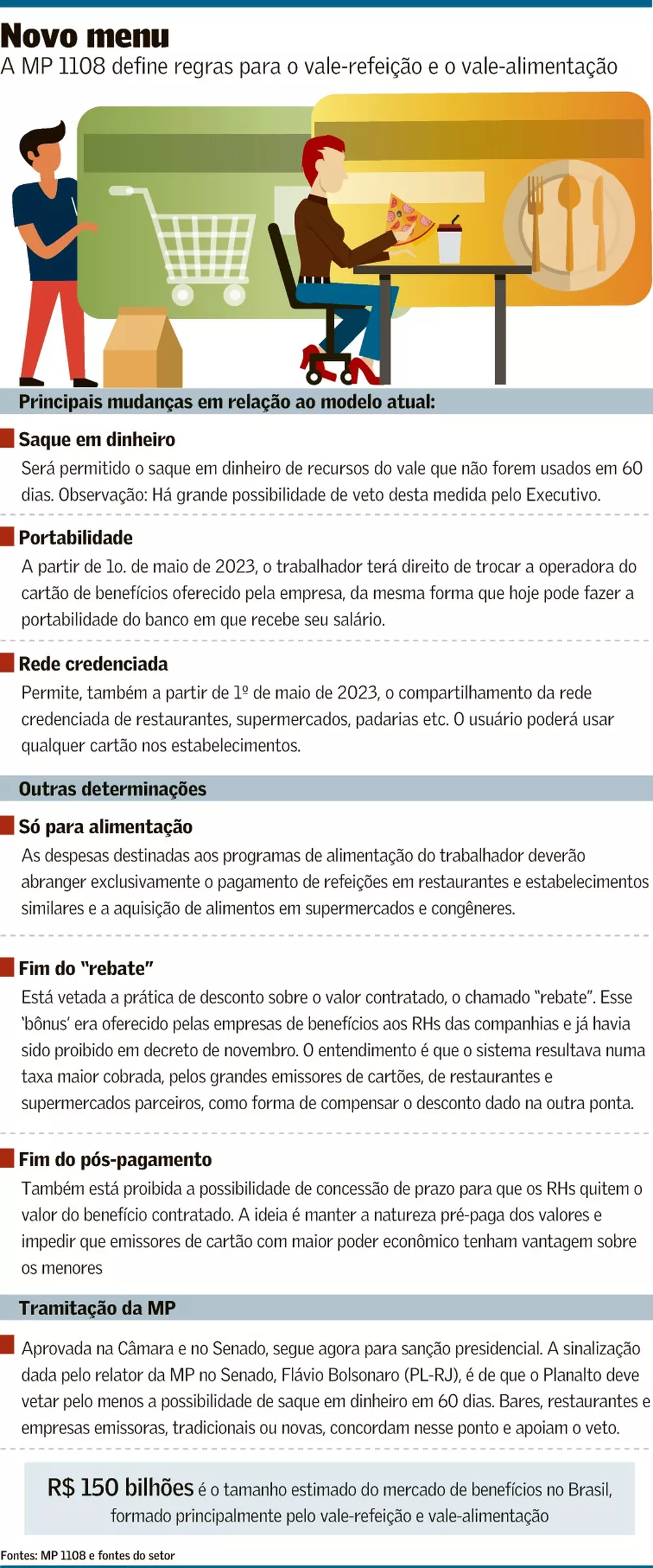 As novas regras para o vale-refeição e o vale-alimentação, iniciadas com um decreto do governo federal em novembro e aprovadas em medida provisória pelo Congresso no início deste mês, devem mudar radicalmente o setor de benefícios corporativos. Trata-se de um mercado de R$ 150 bilhões, liderado hoje por Alelo, Ticket e Sodexo. Recentemente, entraram na disputa startups especializadas e aplicativos de outras áreas como iFood e Mercado Pago (do Mercado Livre). Fintechs como PicPay e Nubank acompanham de perto as discussões.