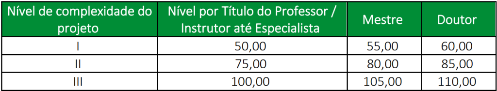 A remuneração dos docentes será baseada na tabela abaixo, também disposta no Anexo I, e cada convocação será de no mínimo 10 horas-trabalhadas.