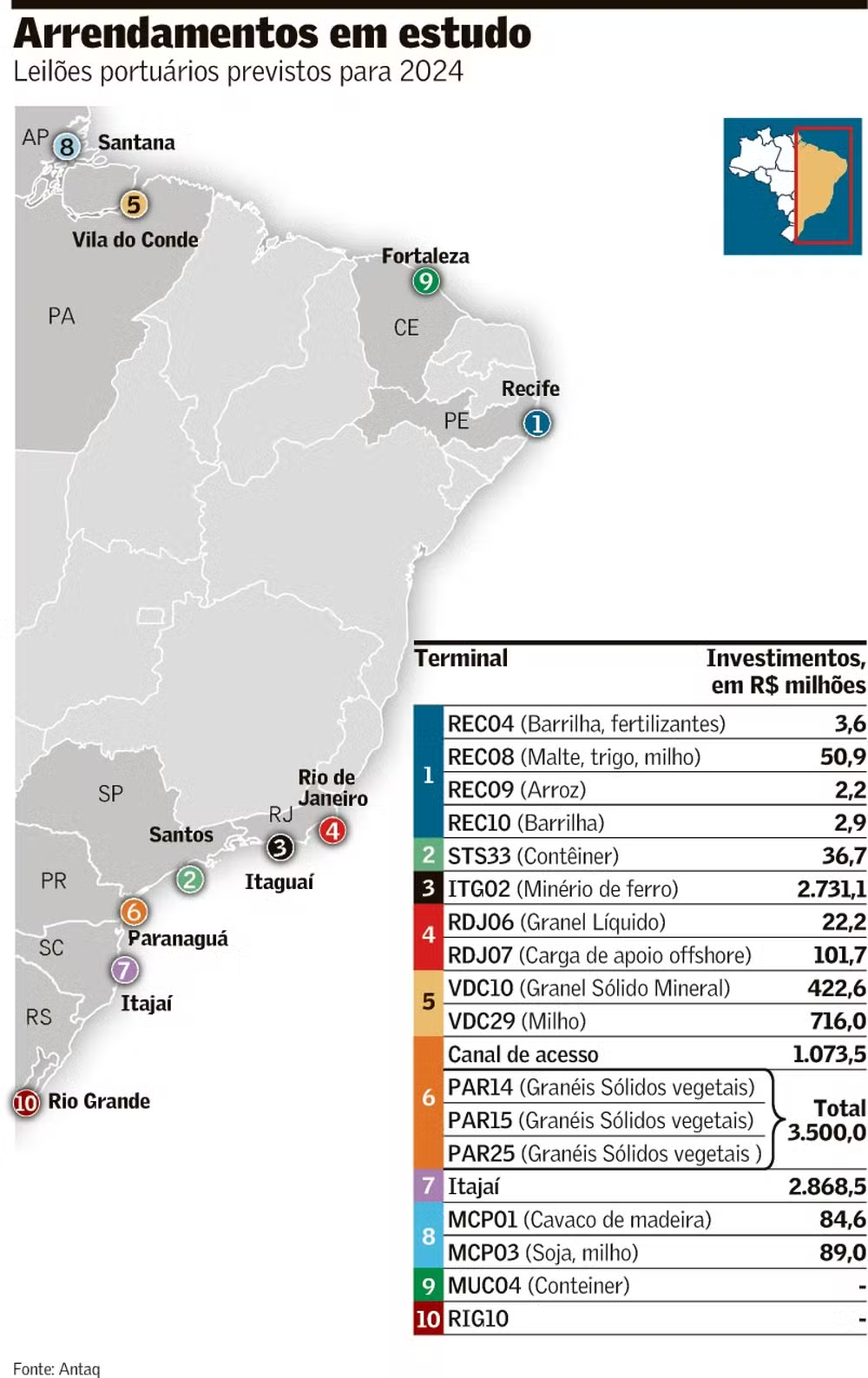 Os principais leilões, contudo, deverão acontecer em agosto, segundo a Antaq. Os projetos mais aguardados são o terminal de granéis minerais em Itaguaí (RJ), com R$ 2,73 bilhões; o arrendamento do porto de Itajaí (SC), que prevê R$ 2,87 bilhões de investimentos; e o leilão do canal de acesso de Paranaguá (PR), com mais de R$ 1 bilhão em obras.