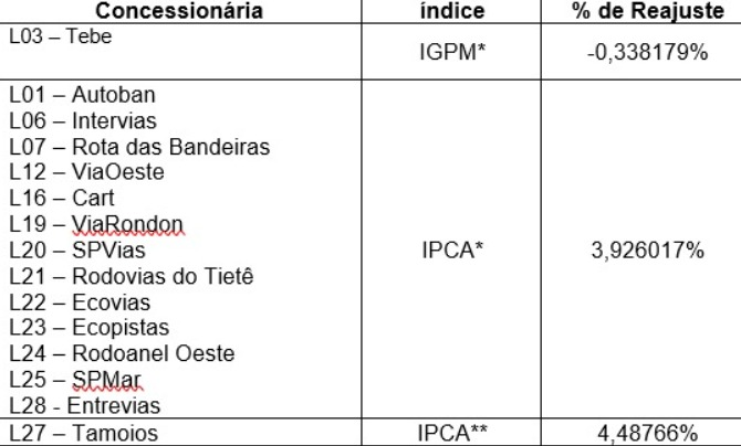 Foi publicada, no dia 27, a tabela com os valores de reajuste anual das tarifas de pedágios nos trechos de rodovias estaduais administrados por 17 concessionárias que integram o Programa de Concessões Rodoviárias do Estado de São Paulo.