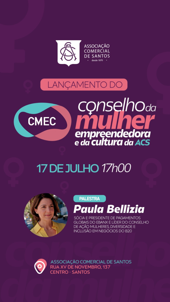 A solenidade será às 17 horas, na sede da ACS, no Centro Histórico. O evento contará com a presença da “santista” Paula Bellizia. A executiva acumula quase 30 anos de carreira e ocupou cargos de destaque em empresas de tecnologia, como Microsoft, Apple, Facebook e Google, onde atuou como vice-presidente de Marketing para a América Latina até o início do ano.