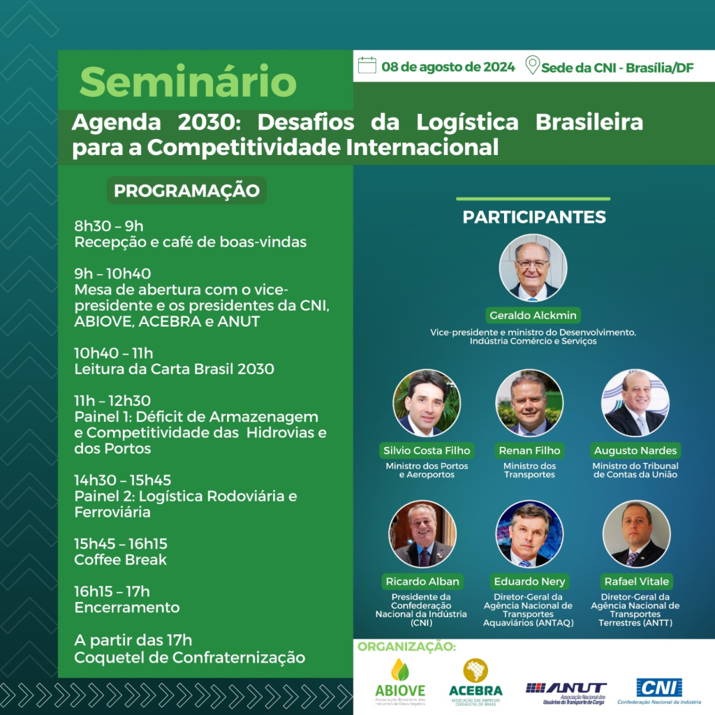 O encontro, promovido pela ABIOVE, ACEBRA, e ANUT, entidades representativas de importantes setores da economia reconhecidos como principais usuários do transporte de cargas, acontece em Brasília, dia 08 de agosto, na sede da CNI – Confederação Nacional da Indústria.