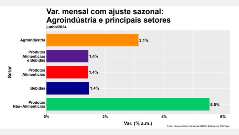 A pesquisa sobre agroindústria, do FGVAgro, revela que após contração em maio, causada, sobretudo, pela tragédia climática no Rio Grande do Sul, a produção agroindustrial voltou a crescer em junho: 3,1% frente a maio (já considerando os ajustes sazonais). Com isso, mesmo com toda a turbulência no estado gaúcho, a Agroindústria brasileira acumulou, no primeiro semestre de 2024, uma alta de 3,9% frente ao mesmo período de 2023.