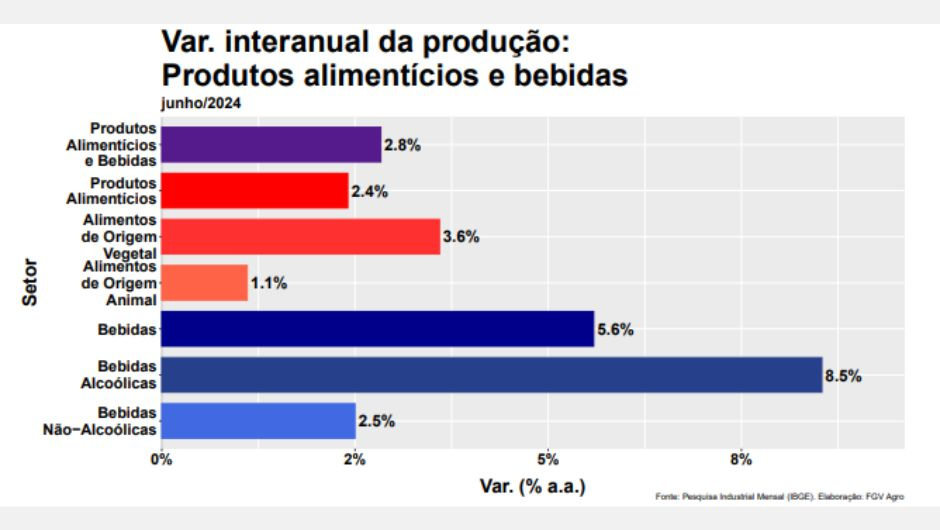 Dado o desempenho favorável no primeiro semestre e uma expectativa de crescimento modesta para o segundo semestre, o FGV Agro projeta uma expansão anual de 3,2% para a produção agroindustrial em 2024, no cenário base.