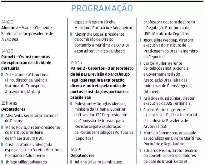 O segundo painel será “Ceportos – O anteprojeto de lei para revisão do arcabouço legal que regula a exploração direta e indireta pela união de portos e instalações portuárias brasileiras”.