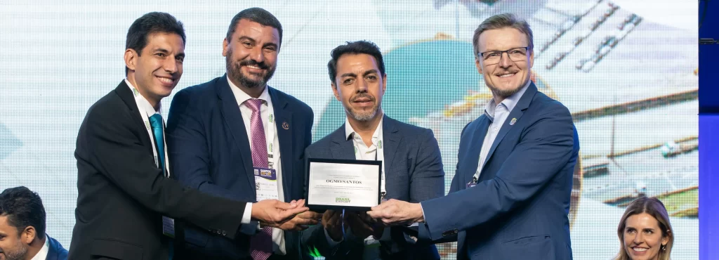 As comemorações dos 30 anos do OGMO/Santos iniciaram na noite da última terça-feira (18) com a homenagem ao órgão gestor de mão de obra realizada ao final da primeira noite do evento Santos Export 2025. Foto: Divulgação/Grupo Brasil Export